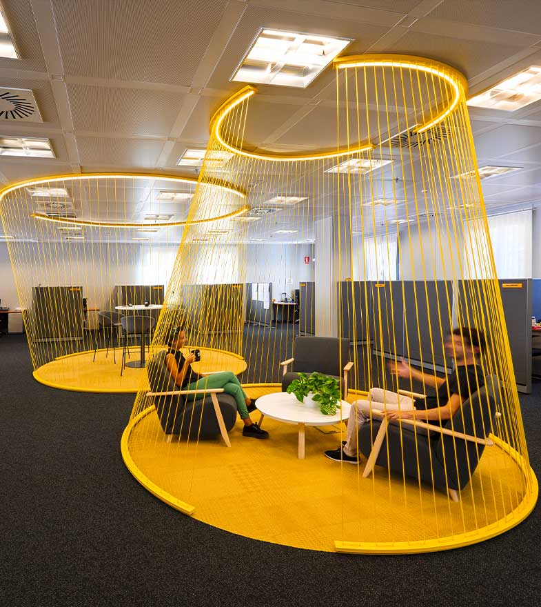 La renovación moderna se centra en la «experiencia del empleado«. Ya no se trata de filas de cubículos, sino de ofrecer diversidad: cabinas insonorizadas para llamadas, zonas lounge para descompresión y áreas de colaboración equipadas con tecnología de videoconferencia de alta gama.
