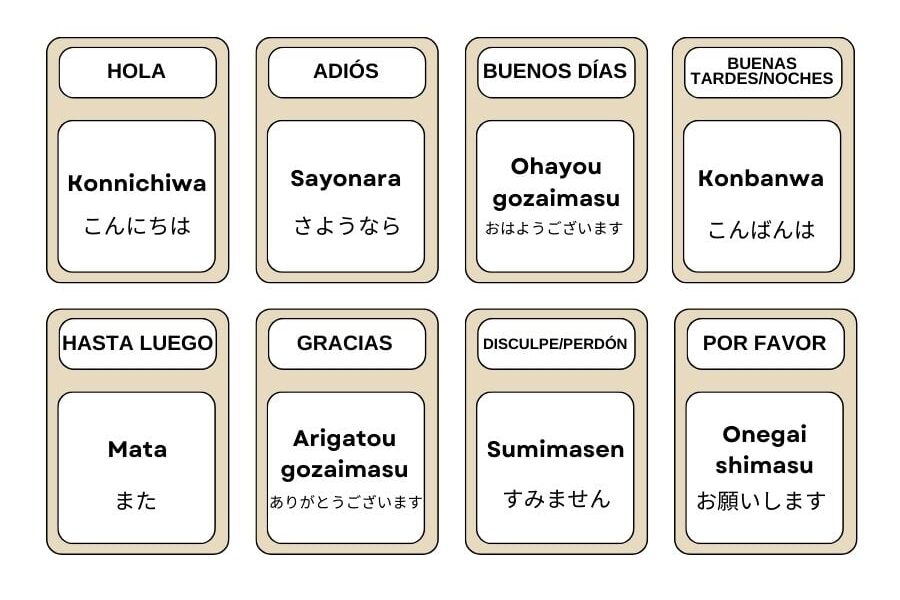 Además de los saludos, asegúrate de aprender frases importantes como «sayounara» (さようなら; adiós), “arigatou gozaimasu» (ありがとう; gracias), y «sumimasen» (すみません; disculpe).