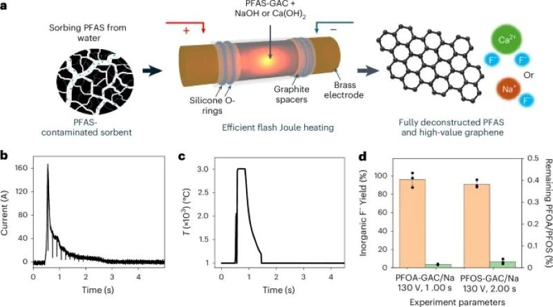 La técnica combina carbón activado granular (GAC) saturado con PFAS y agentes mineralizantes como sales de sodio o calcio. Luego, se aplica un voltaje alto que genera temperaturas superiores a 3.000 °C en menos de un segundo. Esta temperatura extrema: