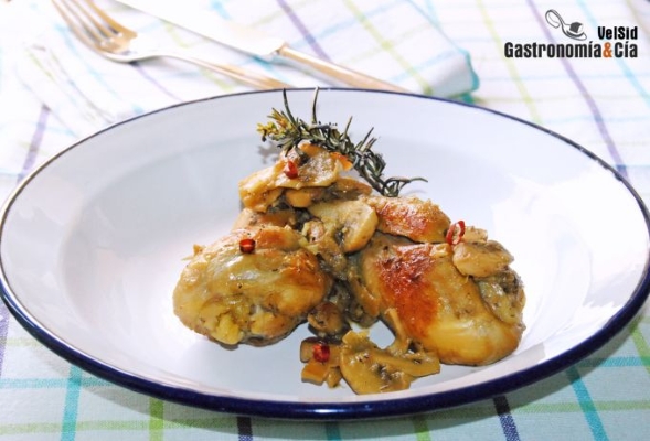 Receta de muslos de pollo guisados con champiñones y ahumados con romero, una receta reconfortante muy fácil de hacer, elaboración paso a paso y con fotos.
