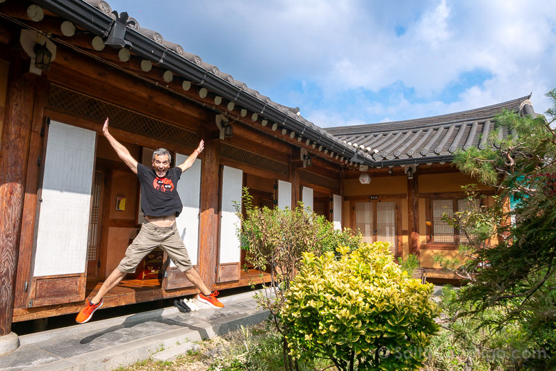Saltando en el patio de un hotel en un hanok, la vivienda tradicional coreana