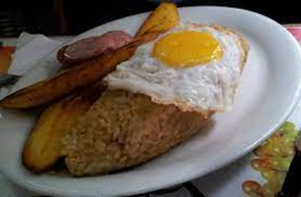 ají, y servido con papas fritas y arroz. Este plato es una fusión de la