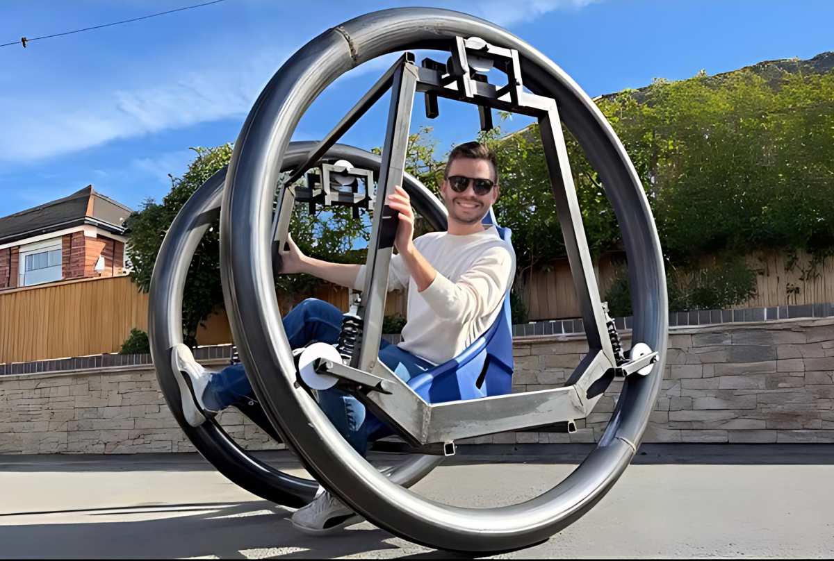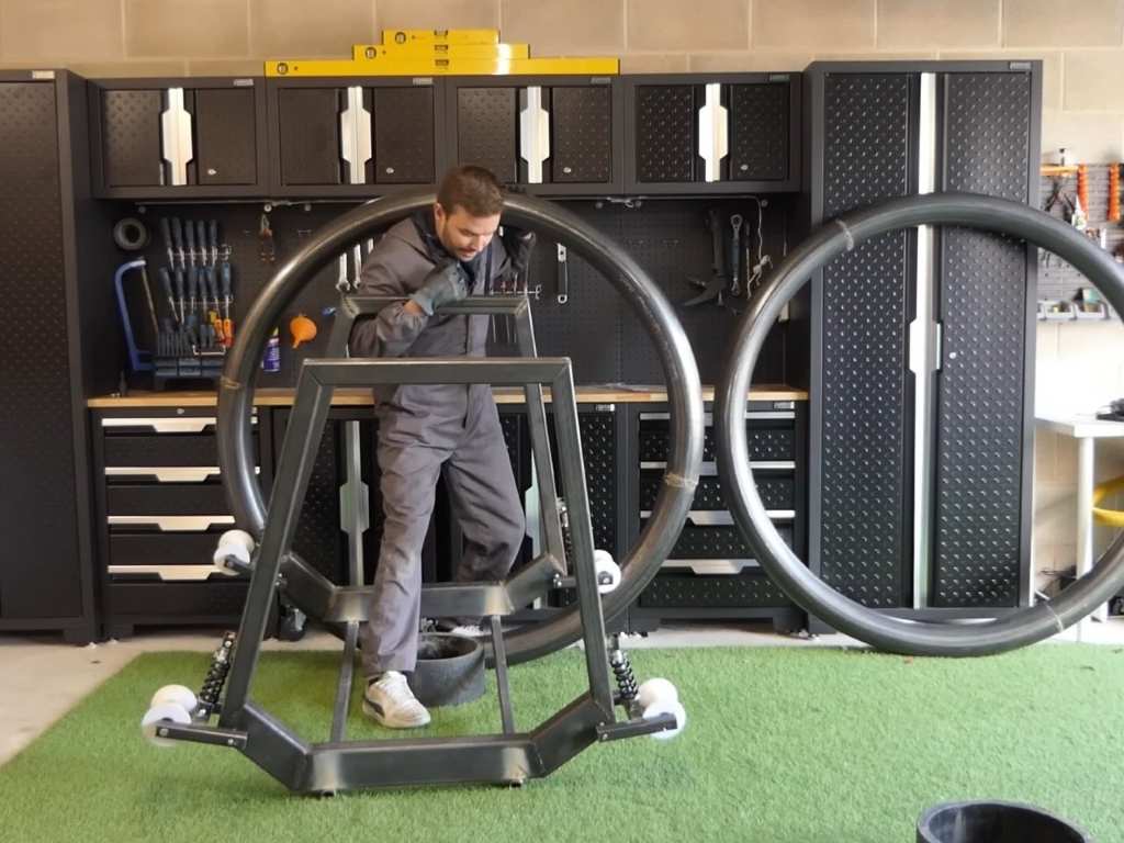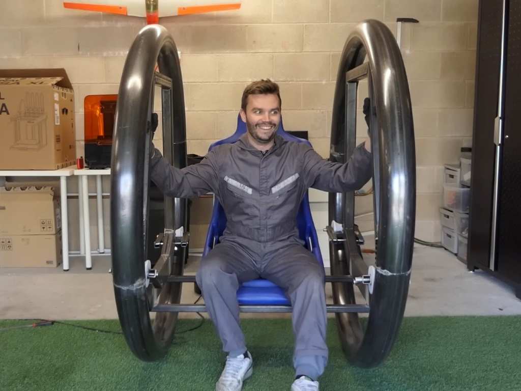Para quienes no estén familiarizados, una diwheel se compone de dos anillos concéntricos en los que el piloto se sienta en un marco suspendido. A diferencia de una monorrueda, no depende del equilibrio dinámico para mantenerse erguida. Es estable por diseño. Los anillos exteriores giran sobre el marco interior mediante rodamientos, y la dirección se logra como en un tanque: cada rueda se impulsa de forma independiente. Suena emocionante… hasta que hay que maniobrar por una calle estrecha o intentar aparcarla.