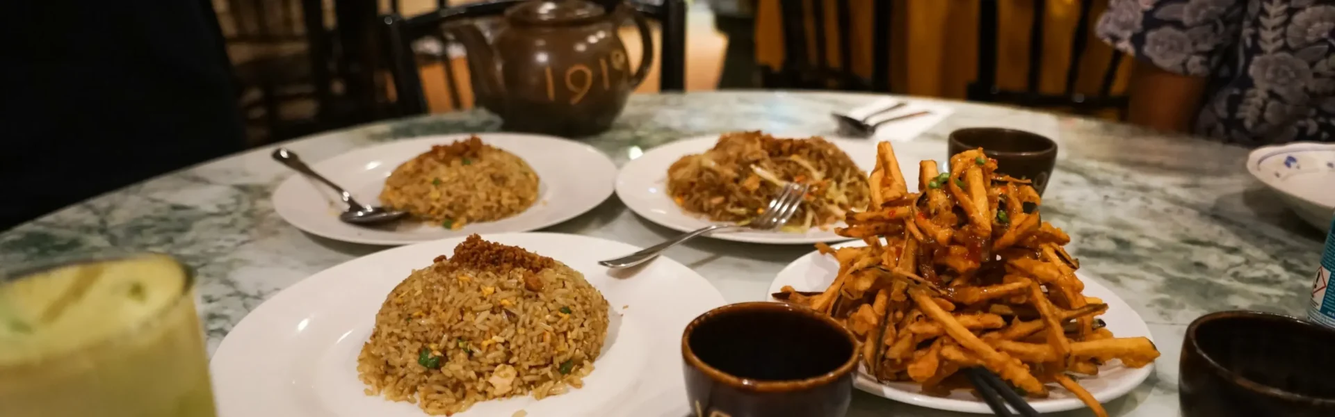 Para empezar, nosotros pedimos las Philippines Eggplant, se trata de un plato de berenjenas rebozadas que parecen patatas fritas. Si no te gustan los vegetales, dale una oportunidad porque te encantarán. Después continuamos con Nyonya Fried Rice y Fried Mee Hoon, se trata de arroz y fideos fritos, son un clásico de la comida asiática. Como proteína probamos una recomendación del chef, Mongolian Chicken. ¡Todo estuvo espectacular!