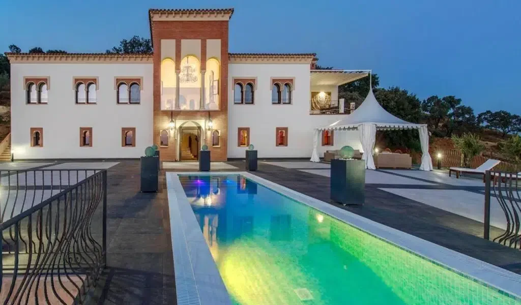 Con ese nombre, Príncipe de Cortegana, no podemos más que esperarnos un palacio. Y, ¡vaya si lo es! De estilo árabe, tiene más de mil metros cuadrados, un aljibe, techos abovedados, un amplio jardín con cenador, piscina infinity exterior con vistas a la montaña, un patio de 200 metros inspirado en el de La Alhambra y un spa.