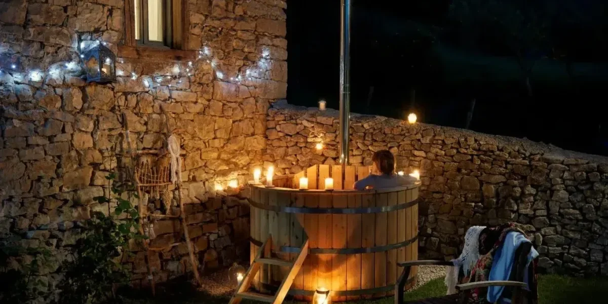 Can Pletis es otro paraíso donde relajarse. Está en Molló, en El Ripollès, en lo alto de la montaña. Se trata de una casa de lujo que, además de ofrecer impresionantes vistas, cuenta con un ofuro japonés de leña en el exterior que permite una experiencia de baño tradicional al aire libre. Imagínatelo en invierno, sintiendo cómo cae la nieve en sus alrededores mientras estamos a remojo en agua caliente.