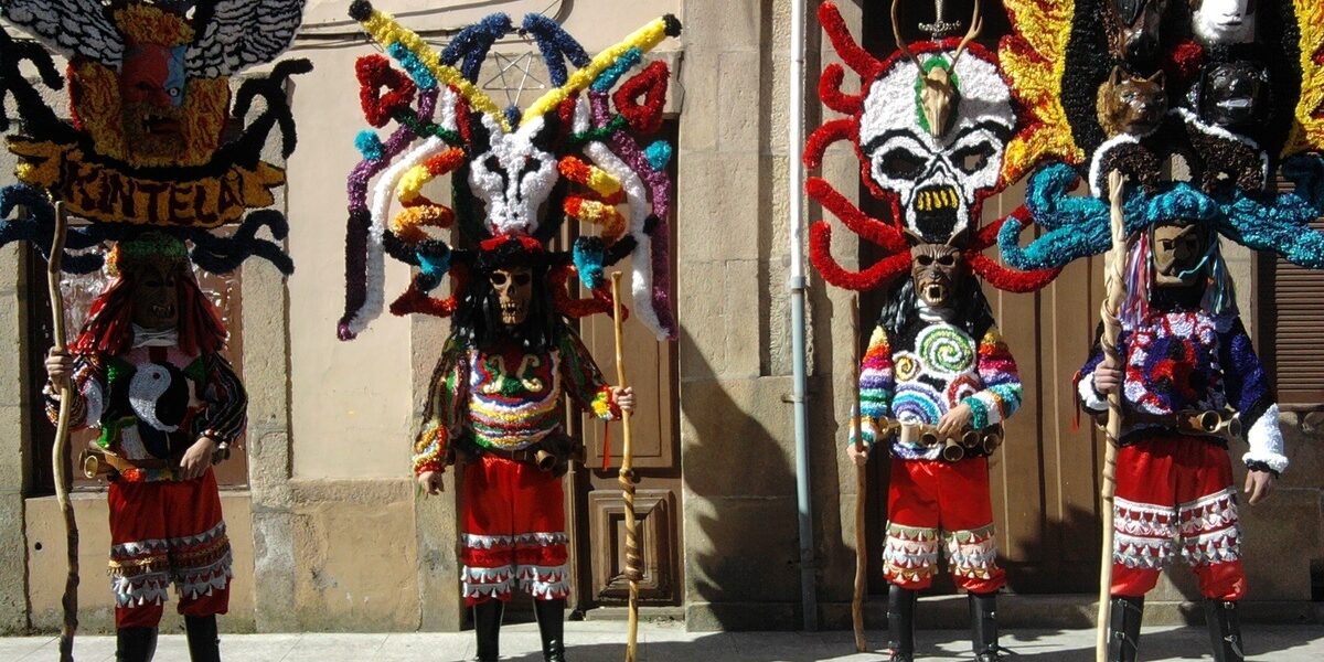 Á‰stos van acompañando a los boteiros, hombres y mujeres que se visten con trajes llenos de color, cinturones de esquilas, máscaras y pantallas que pueden llegar a pesar 20kg, además llevan una “moncaâ€, un palo largo, para dar saltos, y después del desfile se come la androlla.
