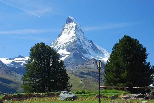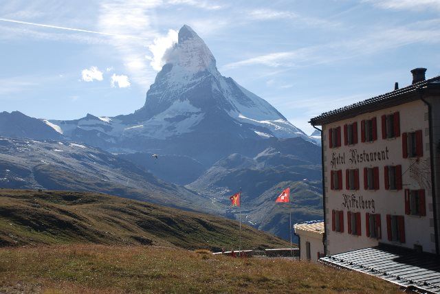 Al fondo, solitario, altivo y majestuoso y por encima del Kulm Hotel emerge el Matterhorn. Varios puntos de avistamiento permiten fotografiarlo desde diferentes perspectivas a cada cual es más espectacular.