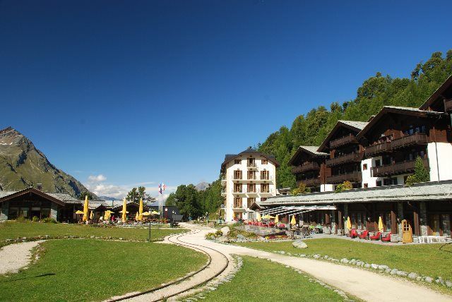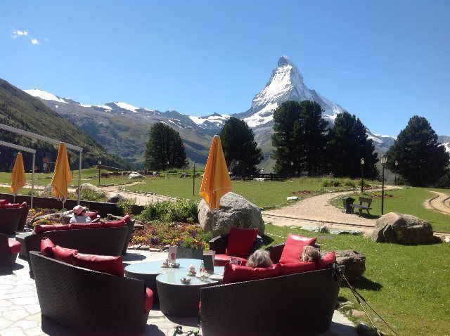 Más adelante hay una zona ajardinada, un pequeño parque infantil, una fuente y hasta una pista de tenis, todo ello en un marco incomparable y con unas maravillosas vistas del Matterhorn.