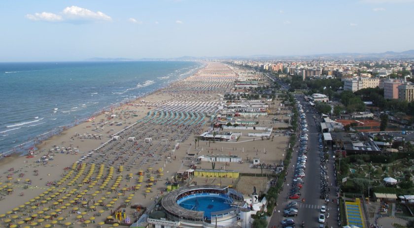 Hay una zona muy famosa para los veraneantes italianos que, sinceramente, no te aconsejo. No por que no sean enormes y el mar esté fenomenal y tranquilo, si no por la cantidad de gene que suele haber siempre. Se trata de la zona costera de la provincia de Ravenna y Rimini, desde Milano Marettima a Riccione pasando por Cesenatico. Nunca he ido por esa zona, pero solo de ver la cantidad de tumbonas y sombrillas a lo largo de kilómetros de costa que se ven en las fotografías (te voy a poner una que no es mía) me dan escalofríos.