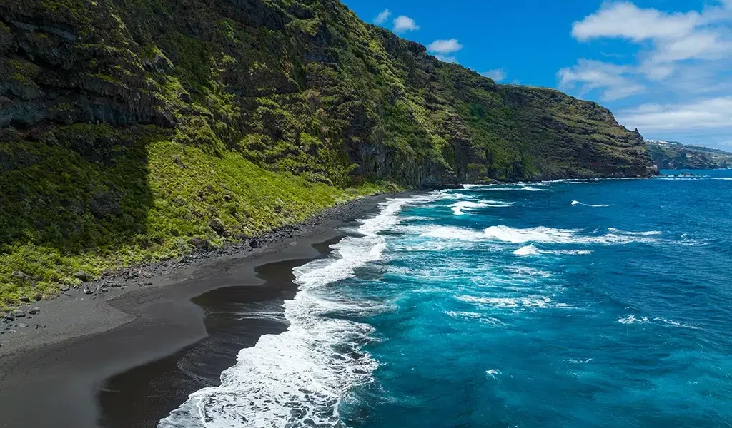Las Islas Canarias cuentan con infinidad de playas de arena negra. Una de ellas es la de Nogaledas, en La Palma, que ofrece una bonita amalgama de colores gracias al entorno en el que se encuentra. El verde laurisilva de sus acantilados, la arena negra volcánica con matices azulados-grisáceos, el blanco de la espuma del mar y el azul cobalto del Atlántico hacen que la imagen sea idílica.