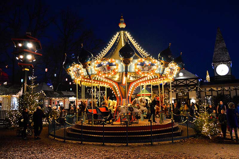 El Parque Tivoli es la representación máxima de la Navidad en Copenhague. Es uno de los parques de atracciones más antiguos del mundo, construido en el siglo XIX.  En el parque podréis disfrutar de diversas atracciones como montañas rusas, carrusel, caída libre… además cuenta con varios espacios que recrean la arquitectura de otros países como una pagoda china y un palacio de estilo árabe.