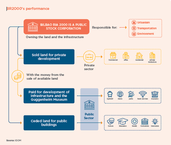 Bilbao Ría 2000 (BR2000) se creó en 1992 con el objetivo de gestionar la regeneración de las zonas afectadas por la desindustrialización de la ría de Bilbao. Esta organización, estructurada como sociedad pública, agrupaba a representantes del Ministerio de Transportes y Obras Públicas (gobierno nacional), el Gobierno Vasco (nivel regional), la Diputación Foral de Vizcaya (nivel subregional) y el Ayuntamiento de Bilbao (gobierno local). Desde su fundación se encargó de encontrar fuentes y mecanismos de financiamiento al margen de los presupuestos públicos tradicionales, incluidas las donaciones de terrenos del gobierno nacional en zonas de reurbanización y la captura de plusvalías.