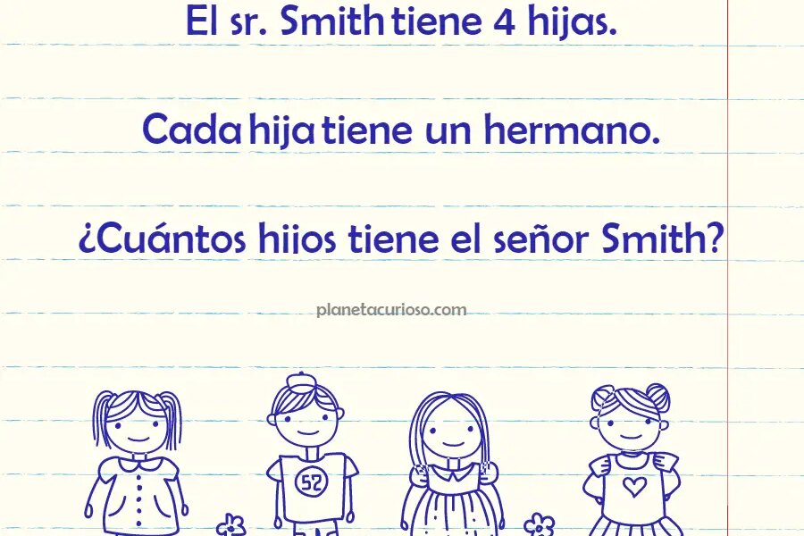 El acertijo puede engañarte fácilmente. Tal vez lo primero que vino a tu mente fue que el Juan Mario (el Sr. Smith) tiene ocho hijos. A esa conclusión llegan porque piensan que cada hijaq tiene un hermano, es decir, cuatro hijas y cuatro hijos = ocho hijos. ¡Error! No es la respuesta correcta. Aunque parece un acertijo matemático, para nada lo es.