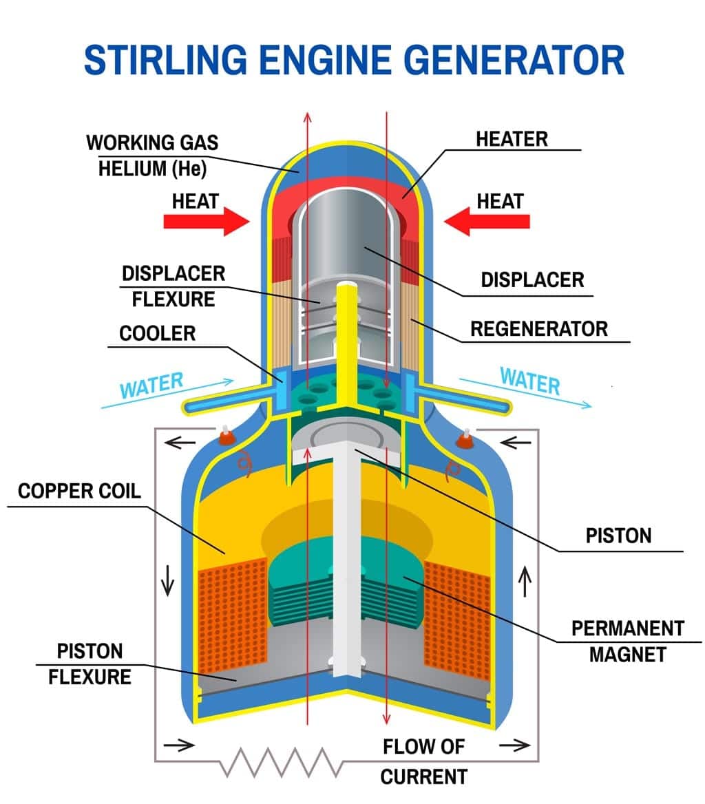 - Dos zonas de temperatura. El motor tiene una zona caliente (que recibe calor desde una fuente externa como el sol, un quemador o calor residual industrial) y una zona fría (que disipa calor al ambiente o mediante un sistema de refrigeración).