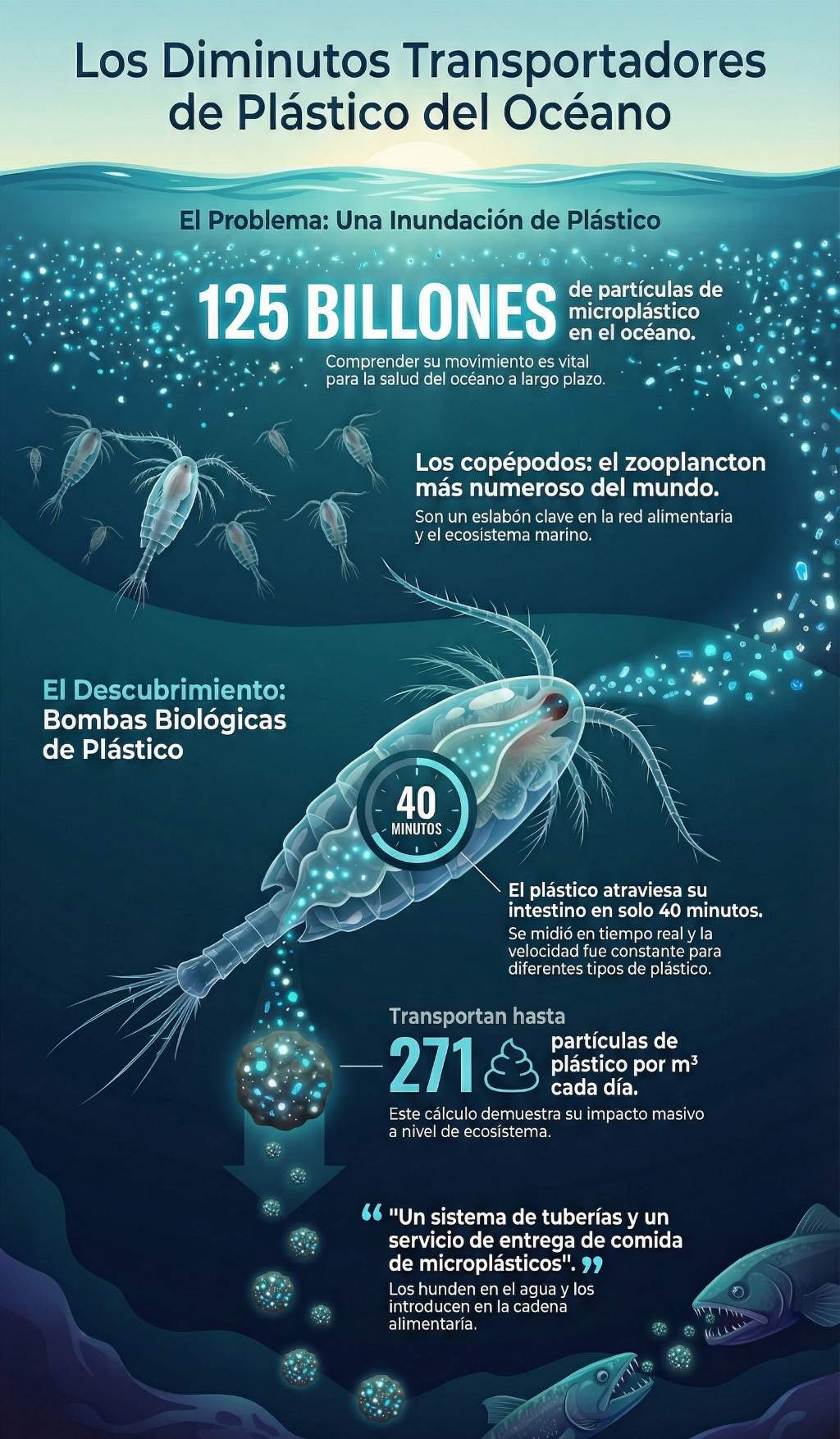 El zooplancton, y en especial los copépodos, domina los océanos en número y función. Están en casi todas partes. Desde la superficie iluminada hasta zonas profundas. Son el eslabón que conecta la producción primaria, las microalgas, con peces, aves marinas y mamíferos.