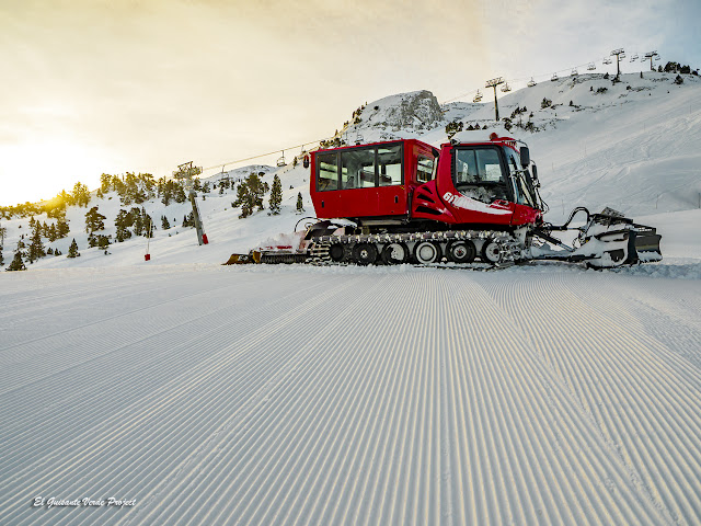 ¿Quién, entre los amantes de la nieve, no sueña con ser el primero en pisarla? Cuando suena el reloj aun es noche cerrada, aunque ya falta poco para que el sol comience su viaje. Sobre las pistas, algunas luces en movimiento nos recuerdan que las máquinas llevan trabajando desde las cinco de la tarde, cuando la estación cierra.