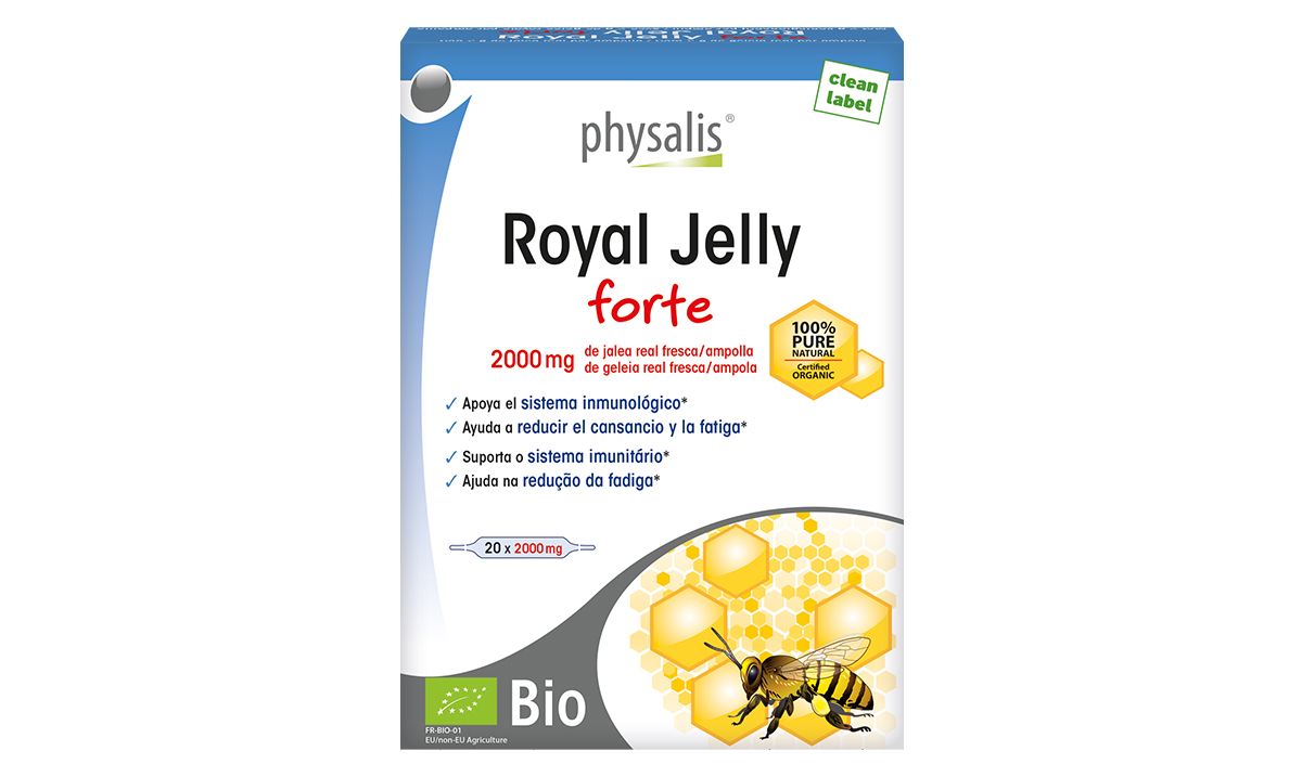 Physalis Royal Jelly forte bio contiene una alta dosis de jalea real fresca y orgánica (2 g por ampolla). Esta jalea es cuidadosamente seleccionada y cosechada por apicultores experimentados y cualificados. Además, este complejo también contiene un extracto de acerola y miel de flores de origen europeo. La acerola es naturalmente rica en vitamina C, que apoya el sistema inmunológico y contribuye a la reducción del cansancio y la fatiga.