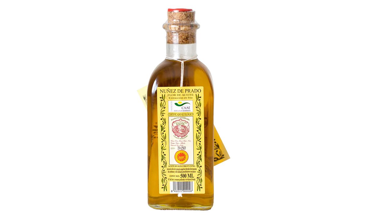 La familia Núñez de Prado produce aceite desde hace siete generaciones en Baena (Córdoba). Para entender lo que tiene de especial este aceite de oliva virgen extra ecológico, primero tienes que saber qué es la flor de aceite: hay una pequeña cantidad de zumo de aceituna que se desprende por sí solo, a través de un filtro, antes de la primera presión. Ese zumo es muy preciado, ya que para conseguir 1 litro se necesitan 11 kilos de aceitunas, y no los 5 kilos que se obtienen de la primera presión. Este aceite es de color oro y aroma afrutado y floral, de sabor amargo y picante, con una intensidad afrutada suave.