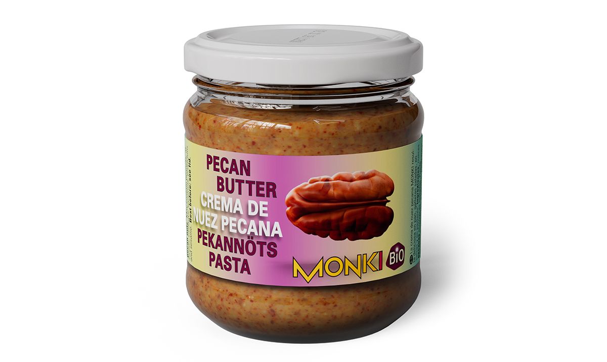 Monki da la bienvenida a un nuevo miembro a la familia de las cremas de frutos secos. Producida en sus propias instalaciones en los Países Bajos, su crema de nueces pecanas ecológica, es elaborada con las nueces pecanas más deliciosas. La nuez pecana larga, de color marrón rojizo, es una perla desconocida para muchos. Pero con su pleno y dulce sabor a nuez y su alto contenido de grasa, es la nuez ideal para hacer cremas de frutos secos. La crema es una base deliciosa para tartas y barritas energéticas.