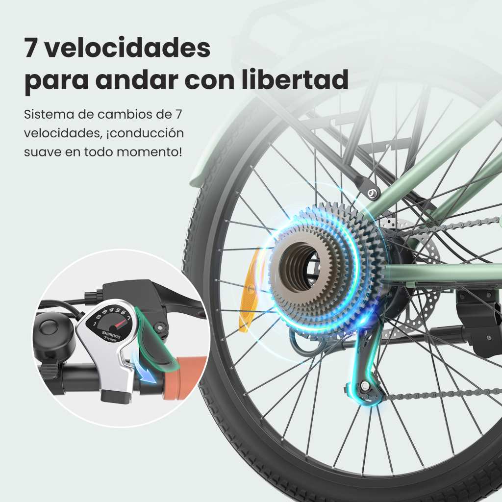 • Cambio Shimano de 7 velocidades, ideal para diferentes terrenos.