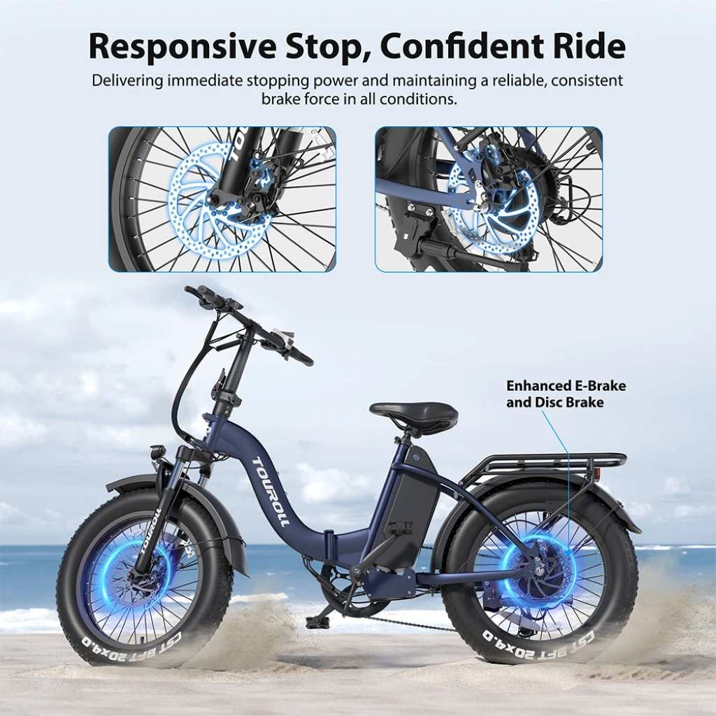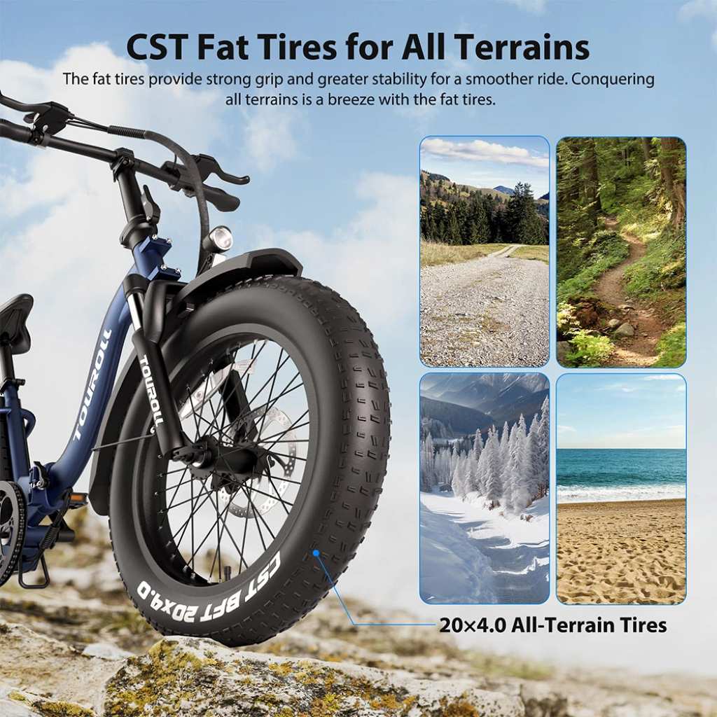 El Touroll S2 está diseñado para quienes buscan movilidad y facilidad de transporte. Su cuadro plegable lo hace ideal para almacenar en espacios reducidos o transportar en vehículos. Con ruedas de 20×4.0 pulgadas, ofrece un agarre excepcional en todo tipo de superficies, desde caminos urbanos hasta terrenos más desafiantes.