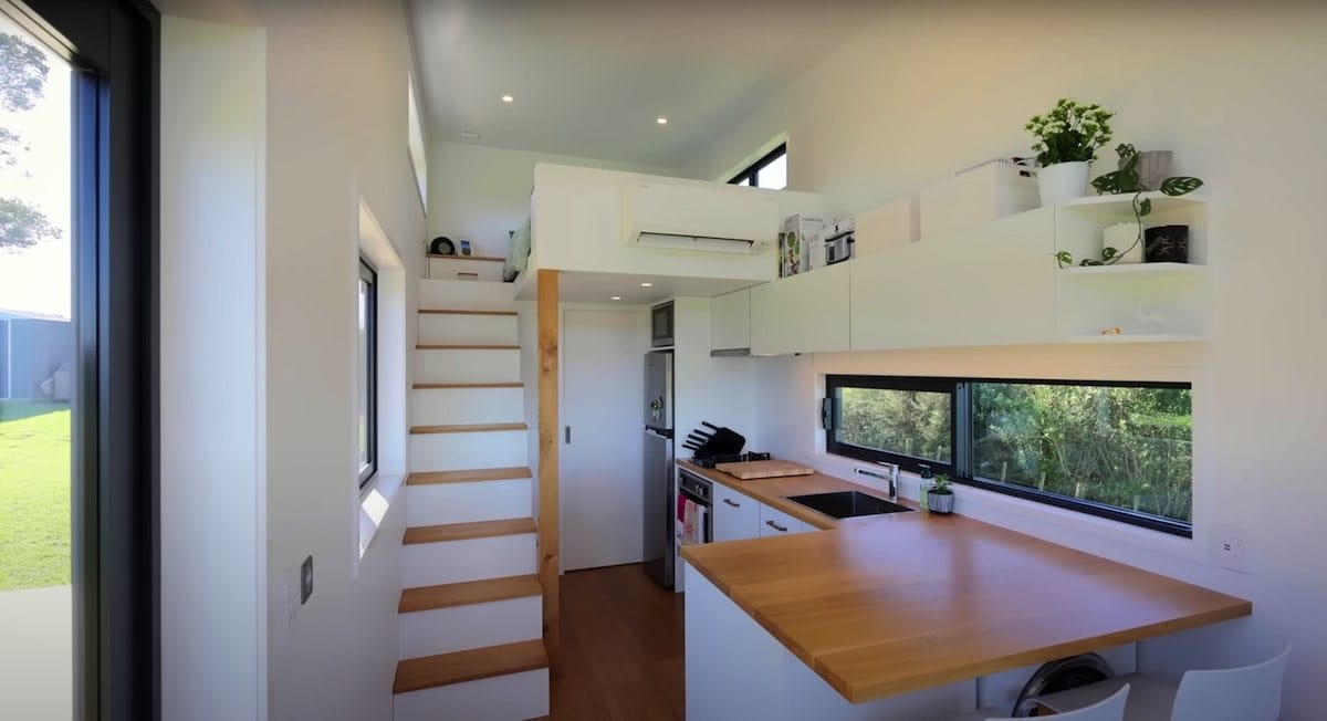 El interior de la casa es una obra maestra de diseño y optimización del espacio. Los colores claros y los elementos de madera dan una sensación de amplitud y calidez.