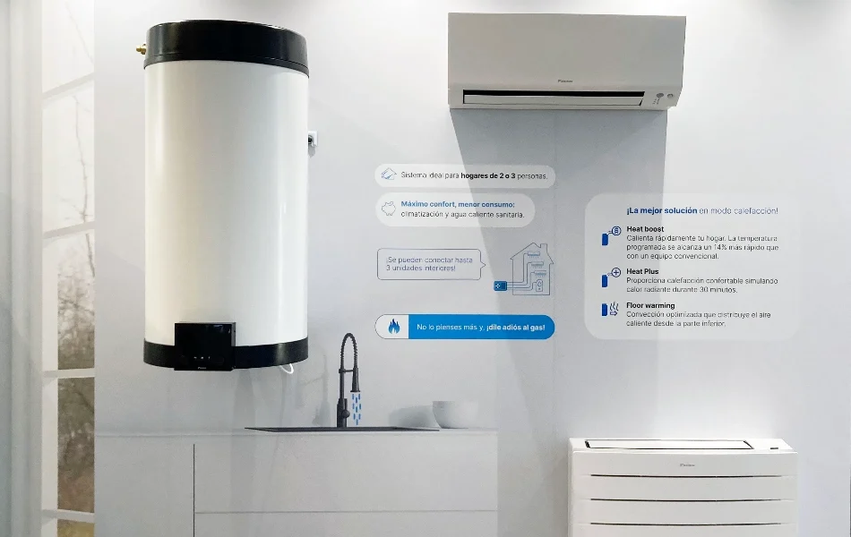 Por lo que he podido leer, esta última es la opción perfecta como complemento de las placas fotovoltaicas, pues permite usar esa energía de origen solar de forma más eficiente. Del mismo modo, es la mejor alternativa al gas natural -y más completa porque incluye el aire acondicionado- cuando vivimos en pisos pequeños.
