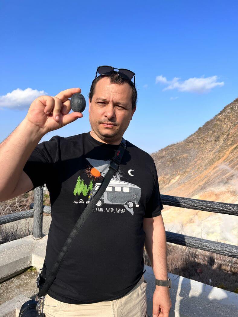 No pierdas la oportunidad de probar los famosos huevos negros de Owakudani. Se dice que estos huevos, hervidos en las aguas sulfurosas, alargan tu vida siete años por cada uno que comas.