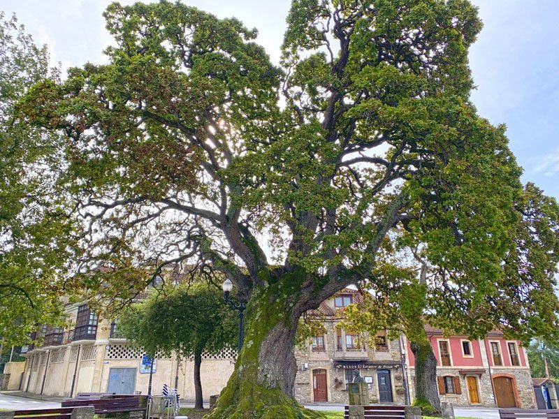Y lo que a mi más me gusta y refuerza es idea de “ciudad jardín”. Árboles centenarios como el roble o carbayo que preside la plaza de Villamanín. Y que presume altivo con sus 17 metros de altura y 15 de diámetro en su copa por estar catalogado como el segundo ejemplar en cuanto a dimensiones del concejo de Gijón.