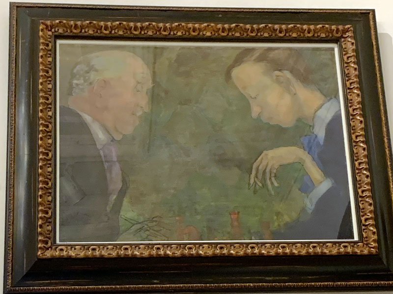 Por ejemplo, aquella mítica partida de ajedrez que Evaristo Valle disputó contra Lenin jugada en París en un café de Montparnasse (que ojo, no es la que se representa en su cuadro “el Ajedrez” pero sí una anécdota que sale a colación al contemplarlo). O su amistad con el poeta Gerardo Diego… O su mirada sobre el paisanaje local, representado en muchas de sus obras, en caricaturas, en viñetas… Contemplar la obra de Valle es como hacer un viaje por la peculiar sociedad de Gijón de la primera mitad del siglo XX.
