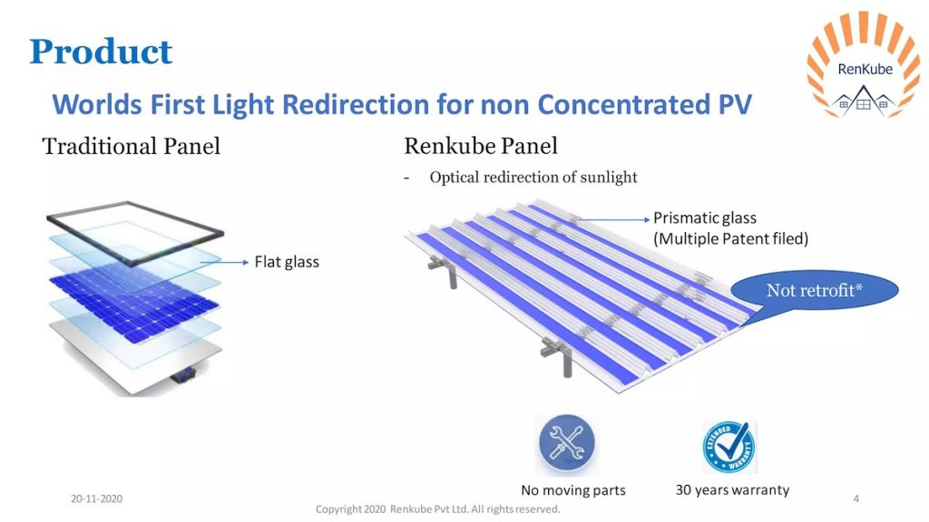 Tres ingenieros, que trabajaban en Cisco en Bengaluru, fundaron Renkube en 2017 con la misión de aprovechar mejor la energía solar en la India, un país tropical. A pesar de no tener experiencia previa en energía solar y renovable, utilizaron sus conocimientos tecnológicos para desarrollar un software basado en IA que crea los mejores diseños para captar luz solar. Así nació la tecnología de seguimiento óptico sin movimiento (MFOT) para paneles solares.