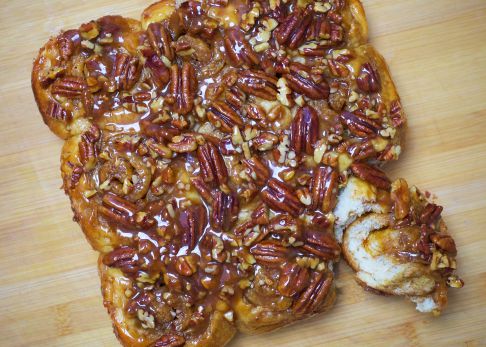 Mientras fermenta, picar la mitad de las nueces pecanas en trozos irregulares y engrasar un molde con mantequilla. Añadir a una sartén la mantequilla, el azúcar moreno, la miel, la miel de caña y la sal, y ponerla sobre fuego medio alto. Mezclar frecuentemente, hasta que todo el azúcar se haya disuelto y se haya formado una mezcla espesa y homogénea. Transferir todo el glaseado al molde, y después repartir las nueces picadas por toda la superficie, así como el resto de nueces enteras.