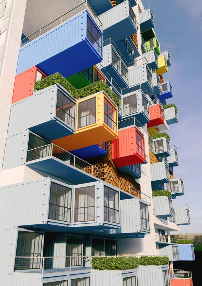 Ganti + Asociates (GA) Design se adjudicó el primer lugar de un concurso internacional en Bombay (India) con un rascacielos de containers que sirve de vivienda temporal en la densa favela de Dharavi. Teniendo en consideración que los containers pueden ser apilados hasta diez pisos sin soporte estructural adicional, la propuesta de GA se trata de un rascacielos de 100 metros de altura, compuesto por una serie de conjuntos autosoportantes de containers apilados por vigas metálicas distribuidas en cada 8 pisos.