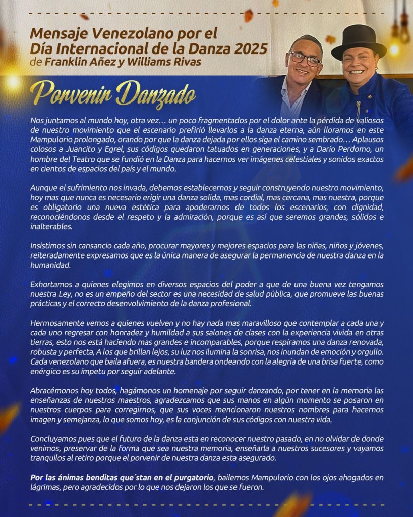 En esta ocasión especial, Rivas ha unido fuerzas con otro importante representante del movimiento dancístico en el país, Franklin Añez, para compartir un poderoso mensaje desde suelo venezolano. ‘Porvenir Danzado’ se llama, ha sido publicado en sus respectivas redes sociales, y se trata de un manifiesto conjunto que reflexiona sobre el presente y futuro de la danza en Venezuela, partiendo de un profundo sentir por la reciente pérdida de valiosos exponentes que han trascendido al “escenario eterno”.
